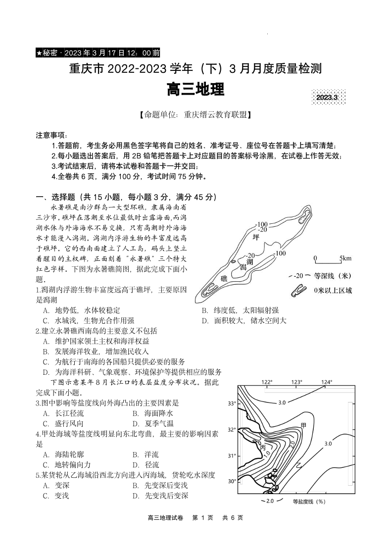 高三地理--重庆缙云教育联盟2023届高三3月质检