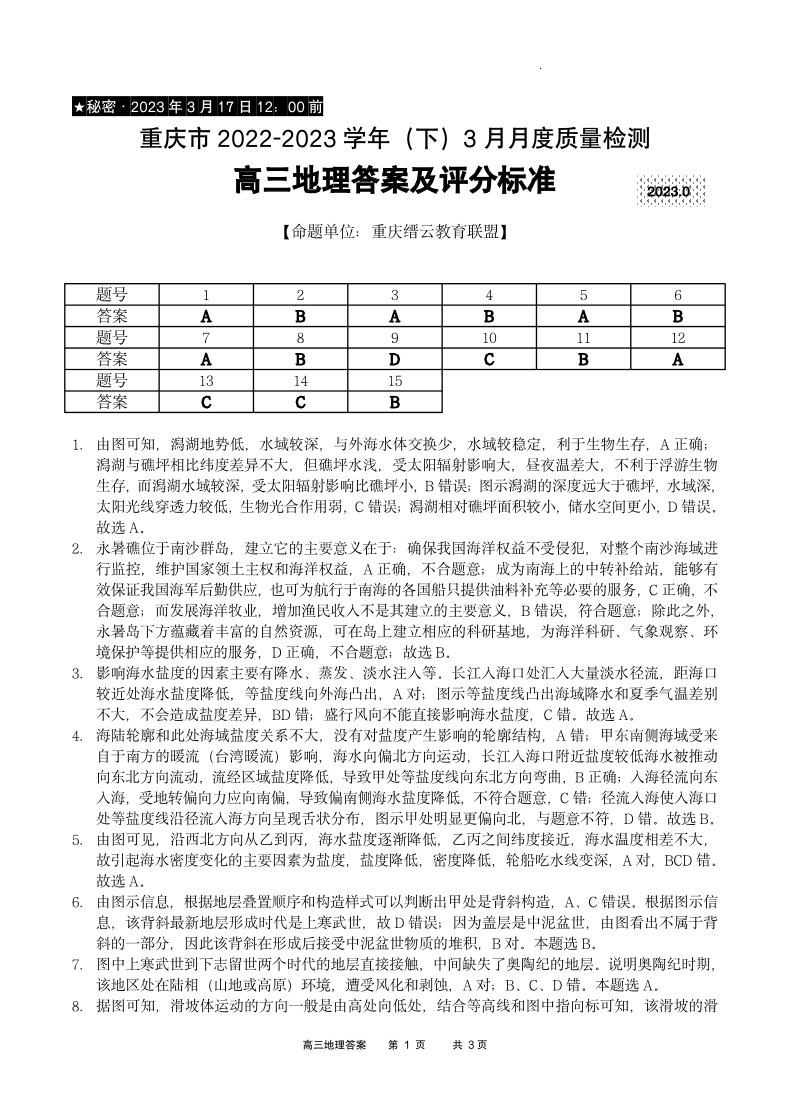 高三地理答案--重庆缙云教育联盟2023届高三3月质检