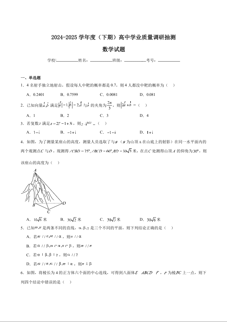 高一数学+答案--重庆市九龙坡、渝中区等4地2024-2025学年高一下学期期末考试试题