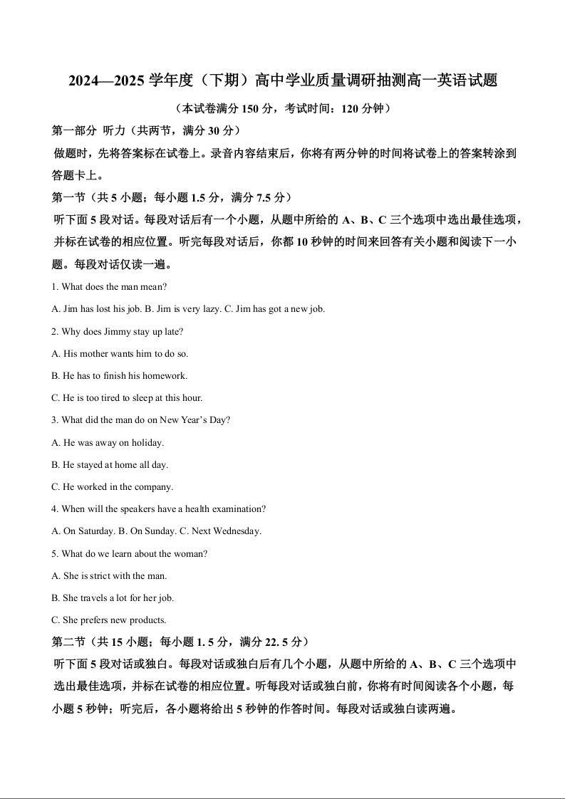 高一英语+答案--重庆市九龙坡、渝中区等4地2024-2025学年高一下学期期末考试试题