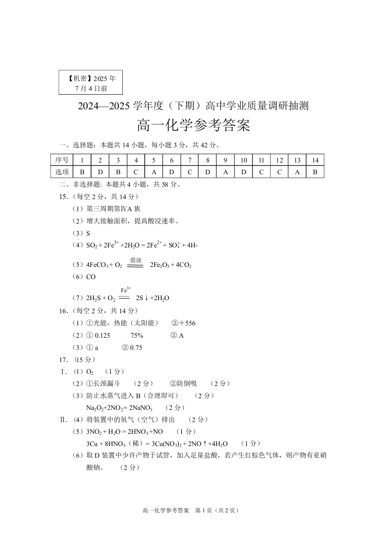 高一化学答案--重庆市九龙坡、渝中区等4地2024-2025学年高一下学期期末考试试题