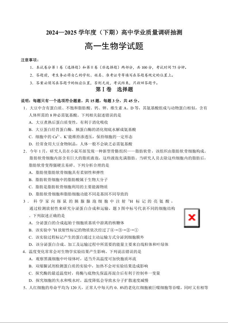 高一生物+答案--重庆市九龙坡、渝中区等4地2024-2025学年高一下学期期末考试试题