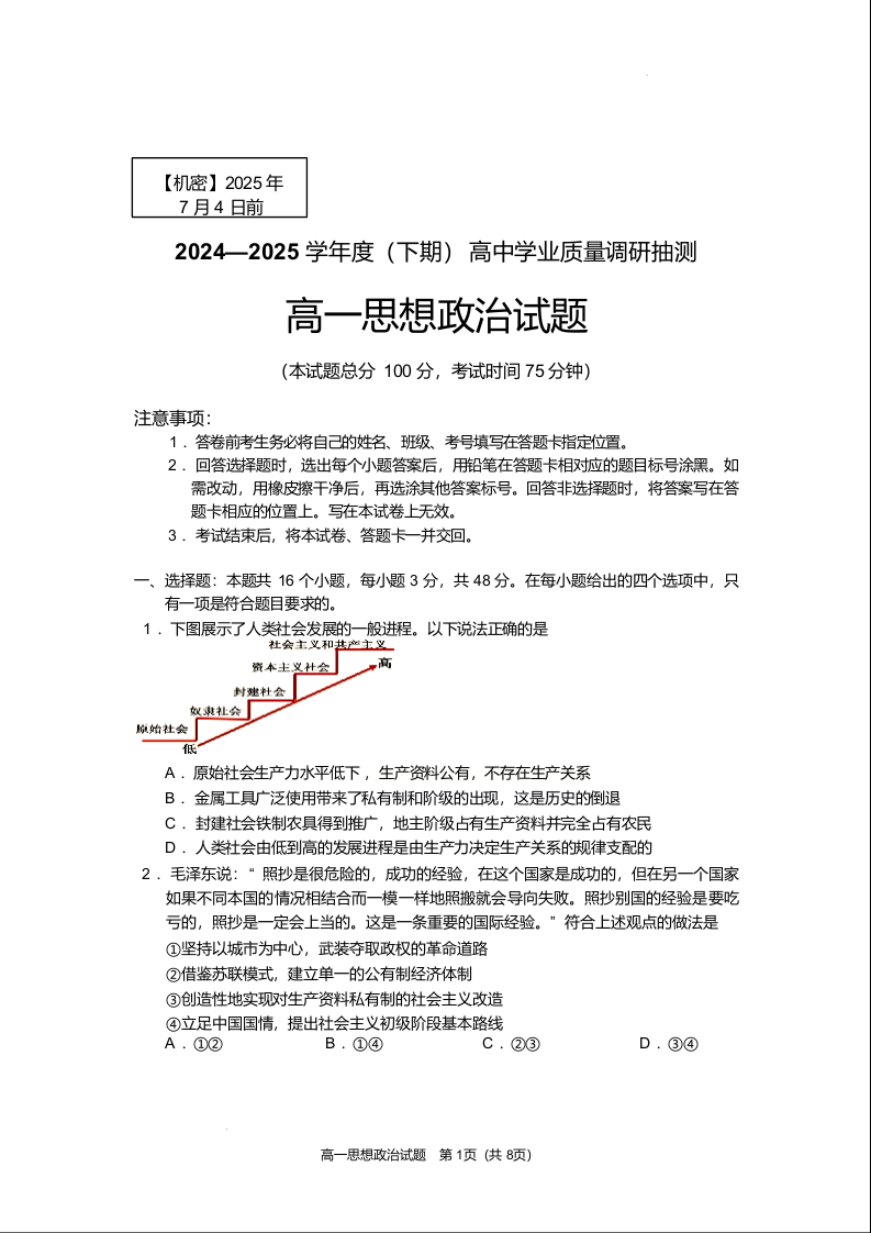 高一政治--重庆市九龙坡、渝中区等4地2024-2025学年高一下学期期末考试试题
