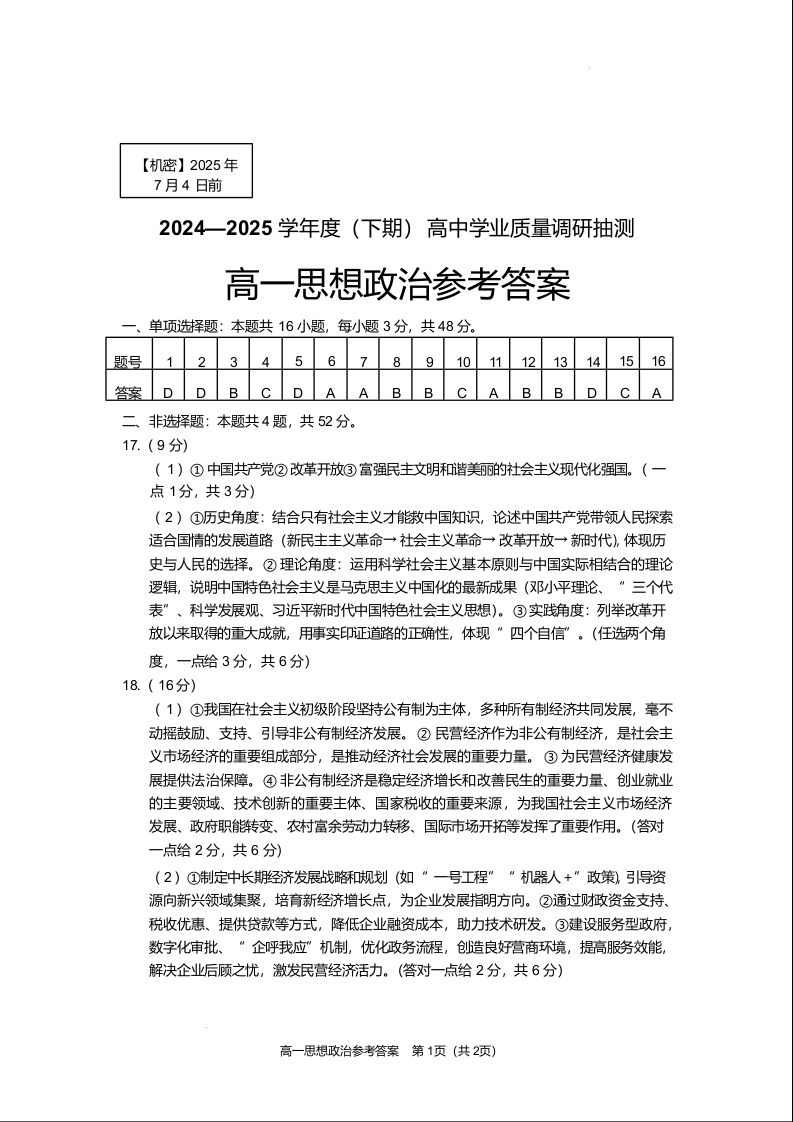 高一政治答案--重庆市九龙坡、渝中区等4地2024-2025学年高一下学期期末考试试题