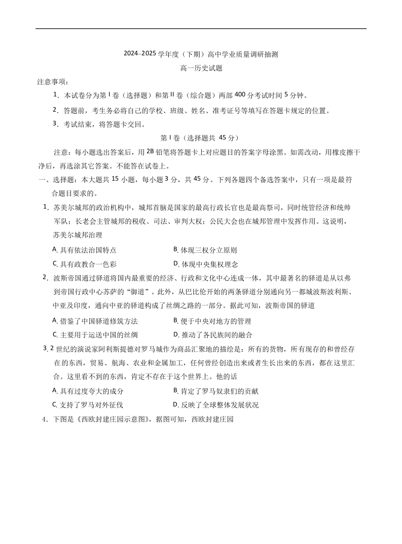 高一历史+答案--重庆市九龙坡、渝中区等4地2024-2025学年高一下学期期末考试试题
