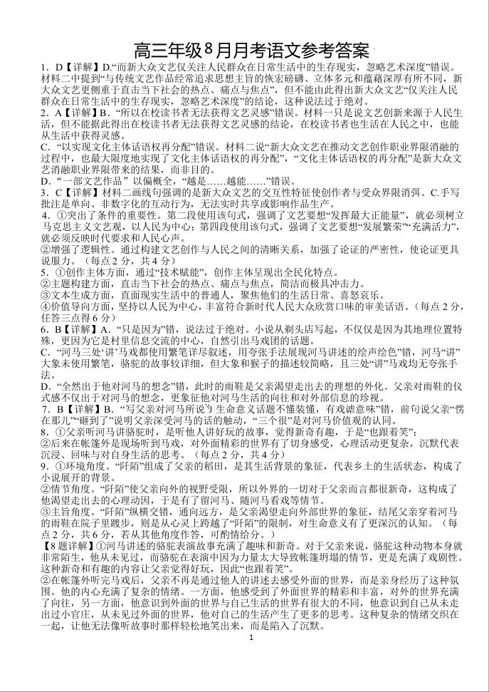 高三语文答案--湖北省荆州市沙市中学2026届高三上学期8月月考