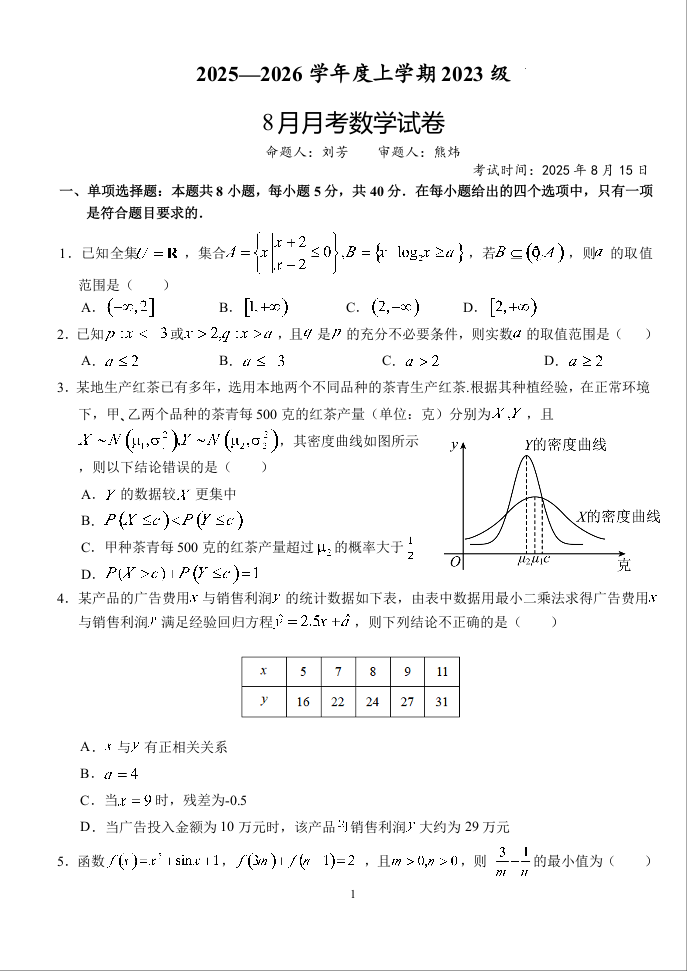 高三数学+答案--湖北省荆州市沙市中学2026届高三上学期8月月考