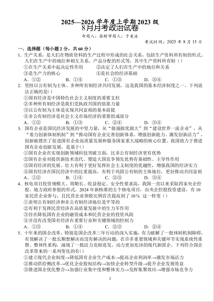 高三政治+答案--湖北省荆州市沙市中学2026届高三上学期8月月考
