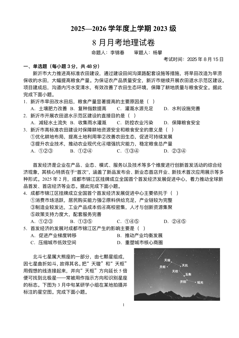 高三地理+答案--湖北省荆州市沙市中学2026届高三上学期8月月考