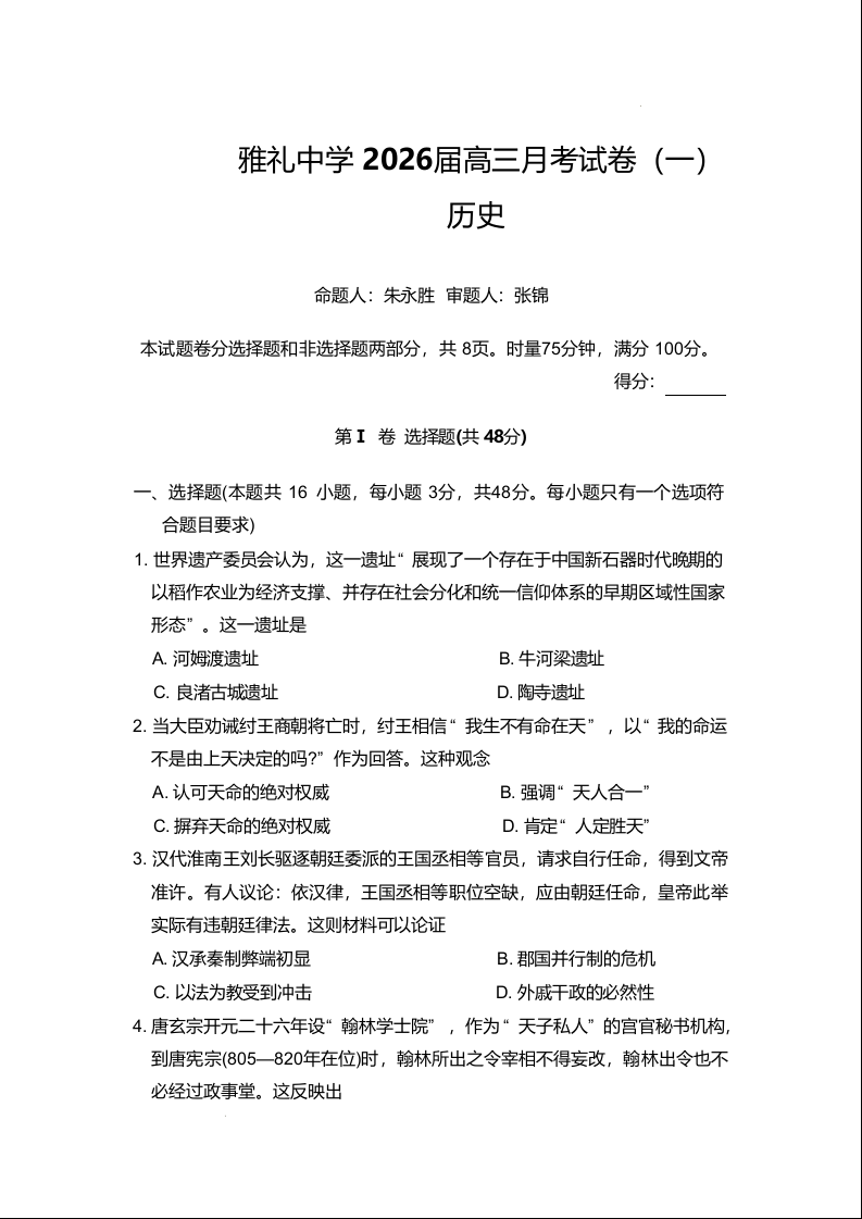 高三历史+答案--湖南省雅礼中学2026届高三上学期月考(一)