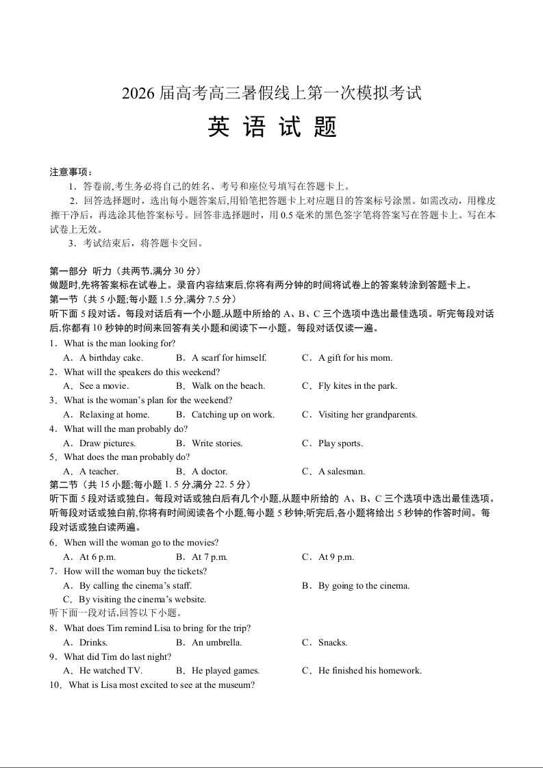高三英语+答案--山东省启思大联考2026届高三上学期暑假第一次模拟考试(开学)