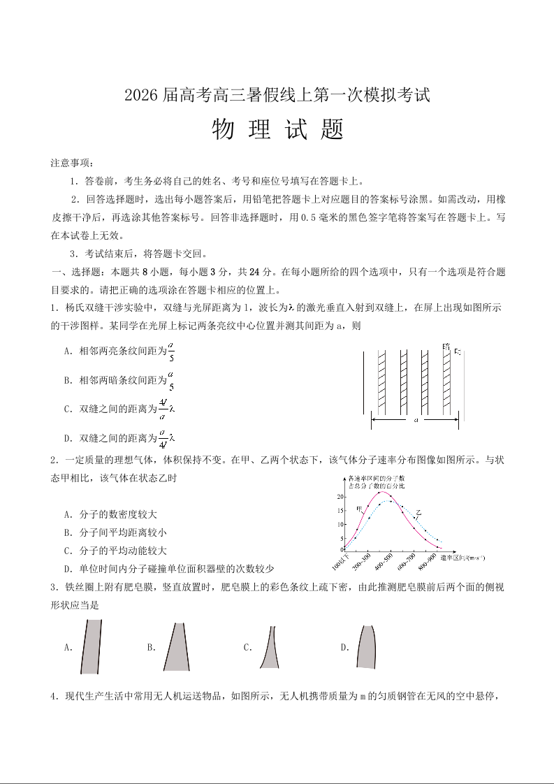 高三物理+答案--山东省启思大联考2026届高三上学期暑假第一次模拟考试(开学)