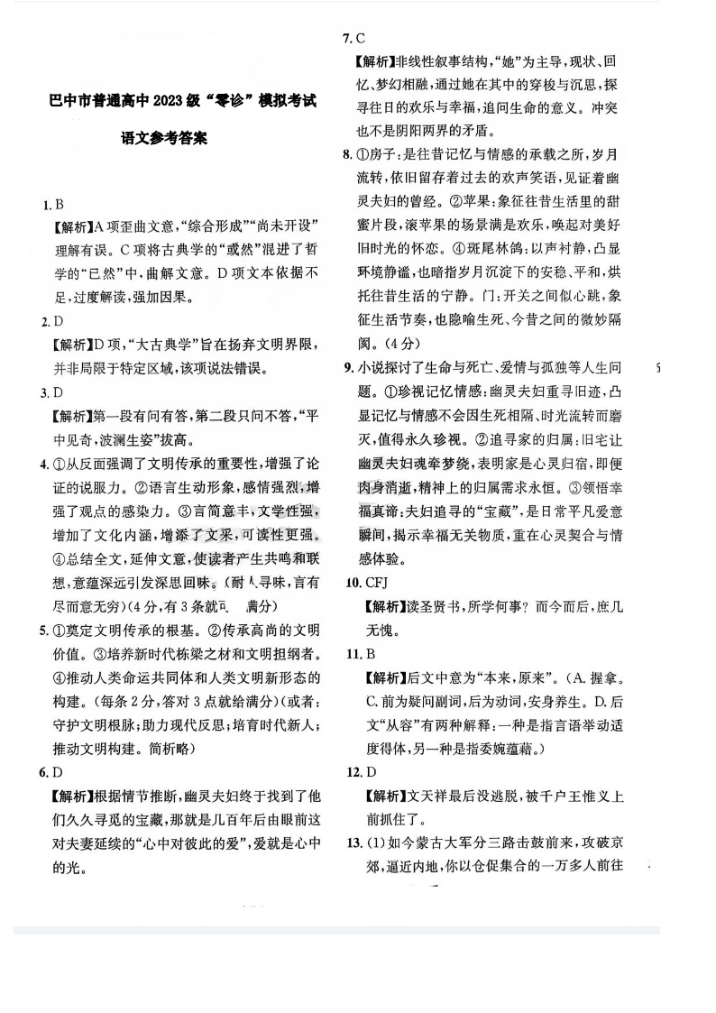 高三语文答案--四川省巴中市普通高中2026届“零诊”模拟考试