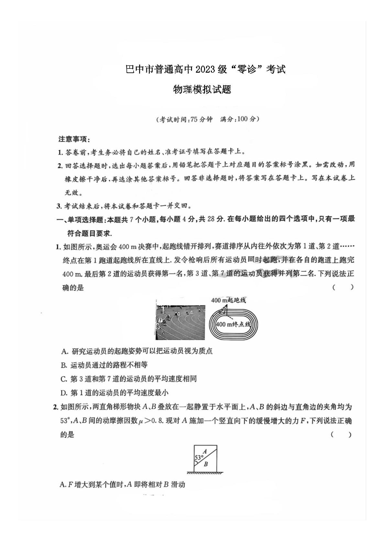 高三物理+答案--四川省巴中市普通高中2026届“零诊”模拟考试