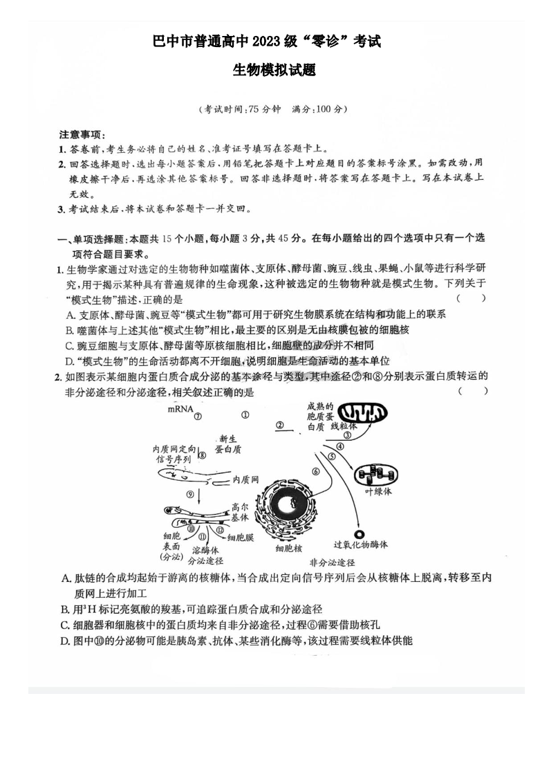 高三生物--四川省巴中市普通高中2026届“零诊”模拟考试