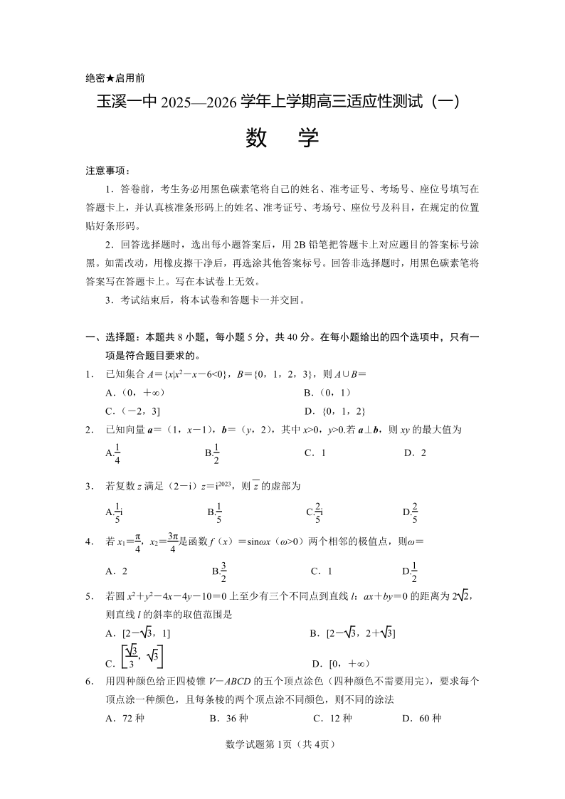 高三数学--云南省玉溪第一中学2026届高三上学期适应性测试(一)