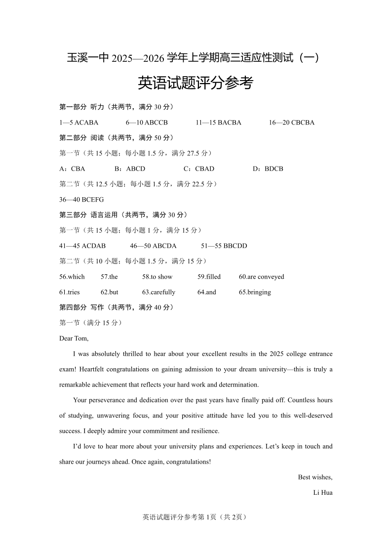高三英语答案--云南省玉溪第一中学2026届高三上学期适应性测试(一)