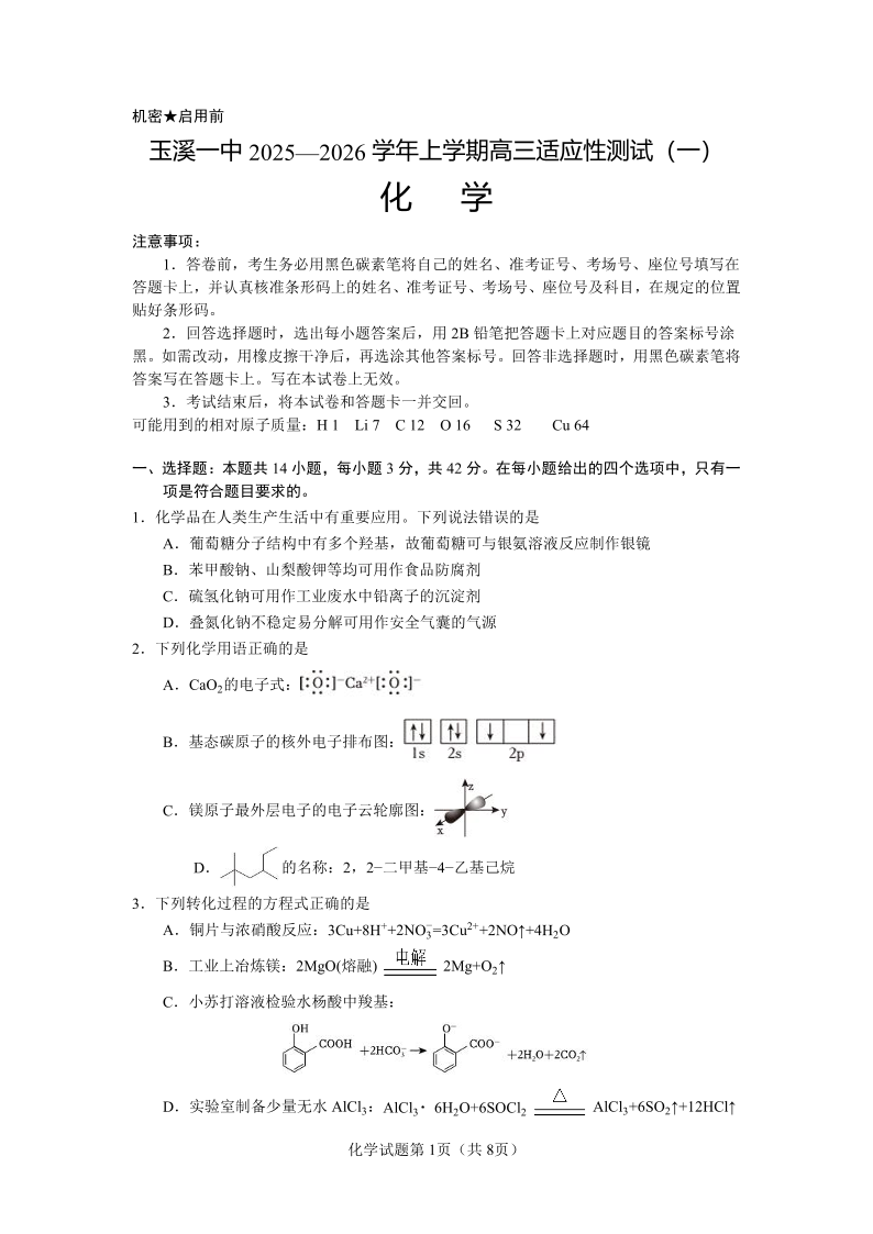 高三化学--云南省玉溪第一中学2026届高三上学期适应性测试(一)