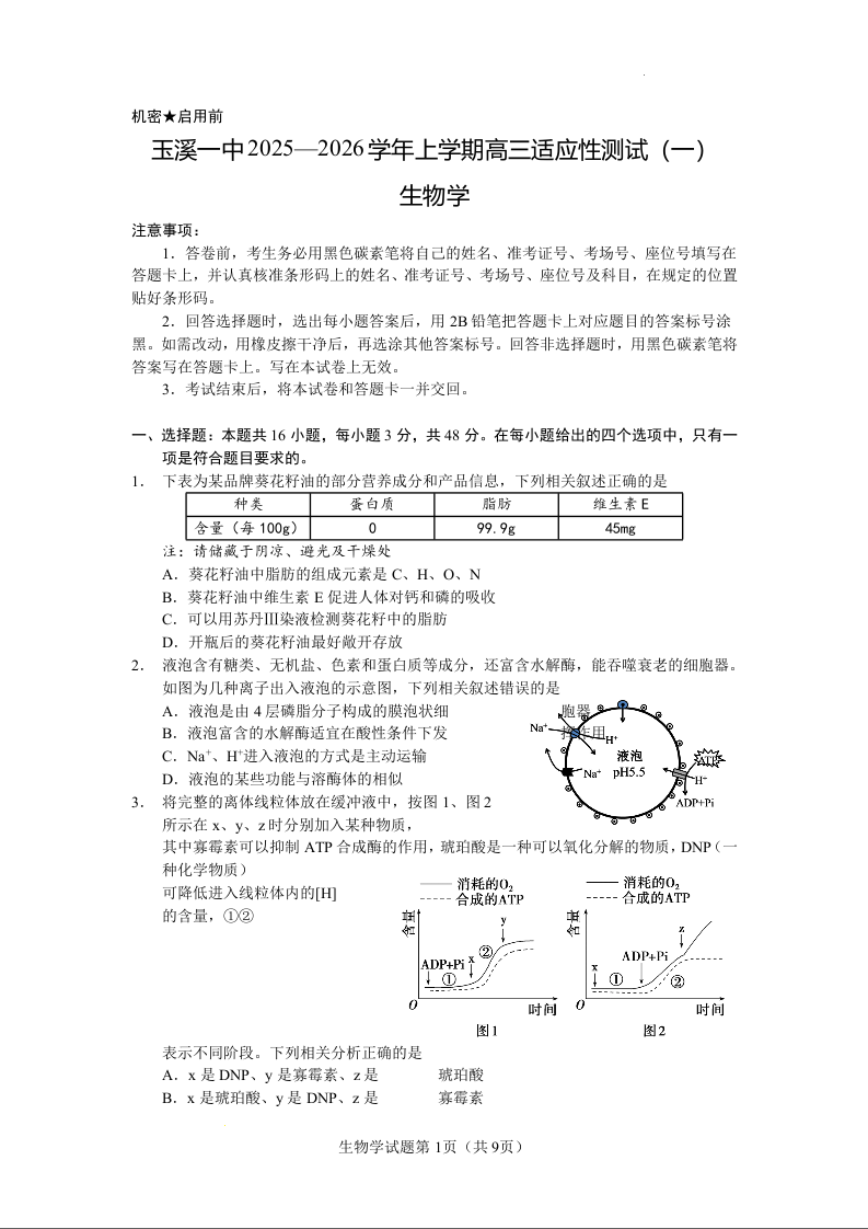 高三生物--云南省玉溪第一中学2026届高三上学期适应性测试(一)