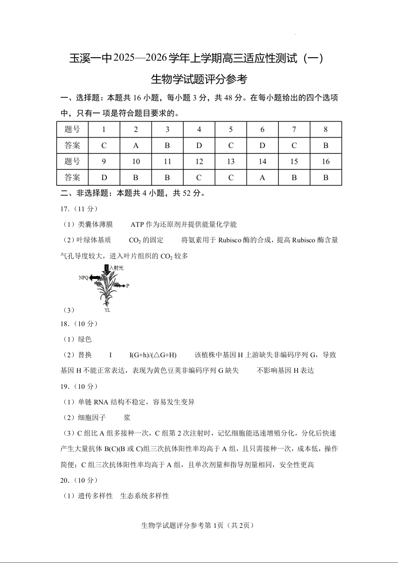 高三生物答案--云南省玉溪第一中学2026届高三上学期适应性测试(一)