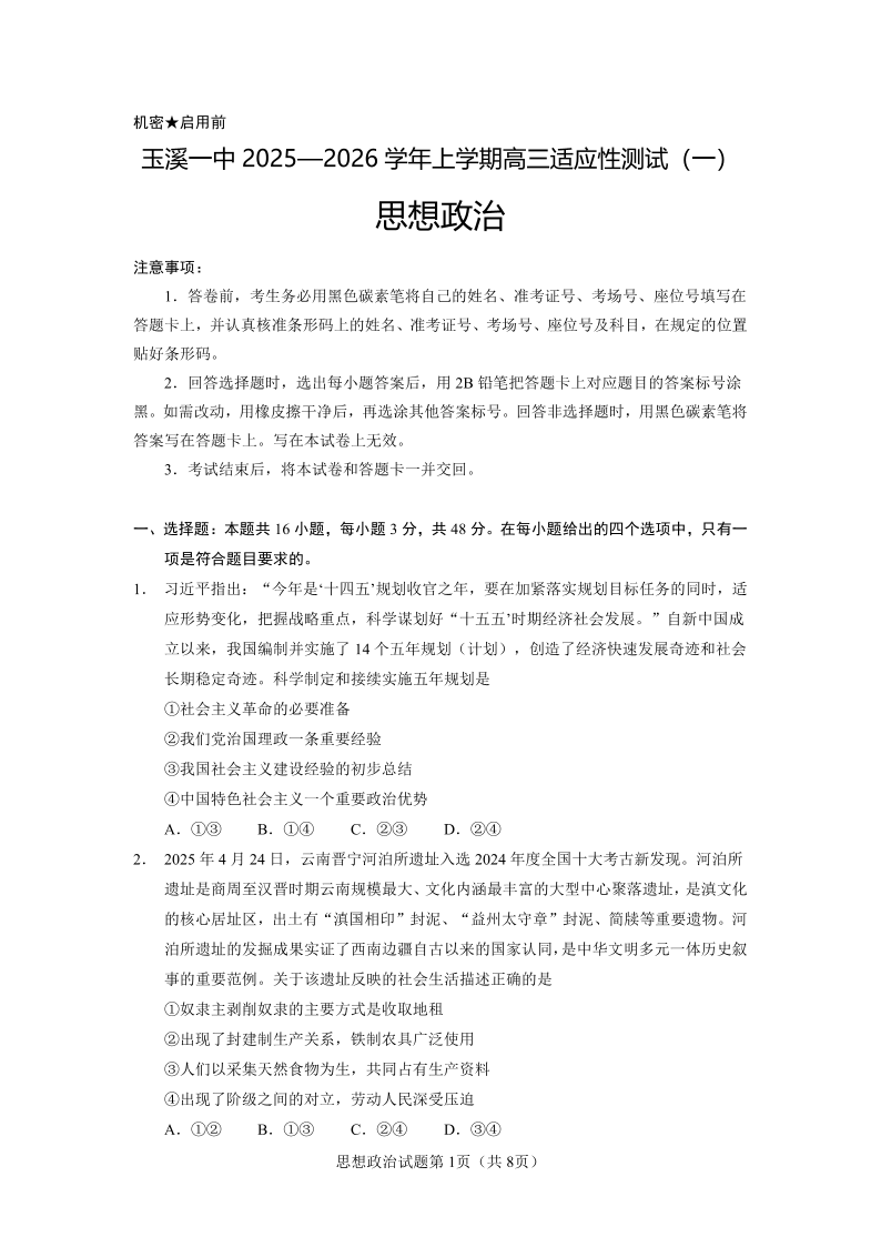 高三政治--云南省玉溪第一中学2026届高三上学期适应性测试(一)