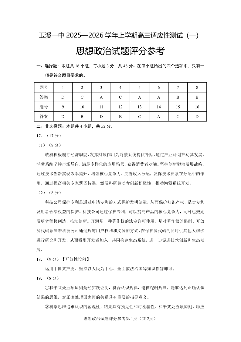 高三政治答案--云南省玉溪第一中学2026届高三上学期适应性测试(一)