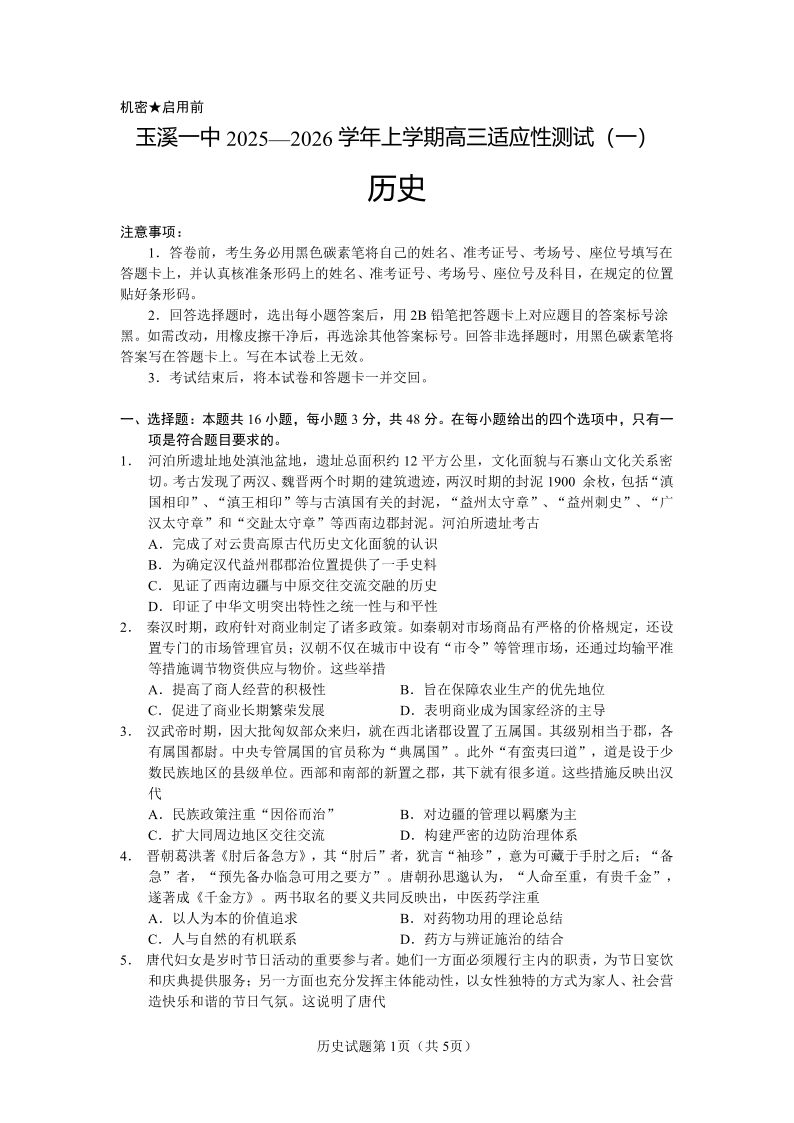 高三历史--云南省玉溪第一中学2026届高三上学期适应性测试(一)