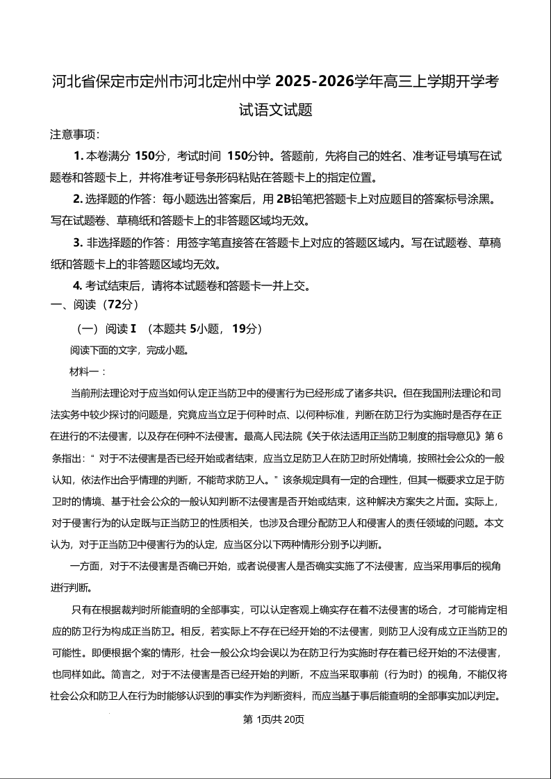 高三语文(解析版)--河北省保定市定州中学2026届高三上学期8月开学考试