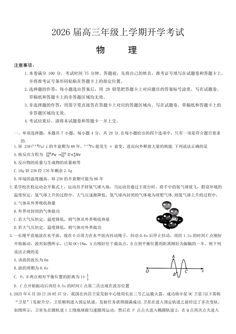 高三物理+答案--河北省保定市定州中学2026届高三上学期8月开学考试