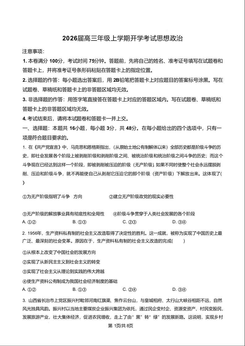 高三政治(原卷版)--河北省保定市定州中学2026届高三上学期8月开学考试
