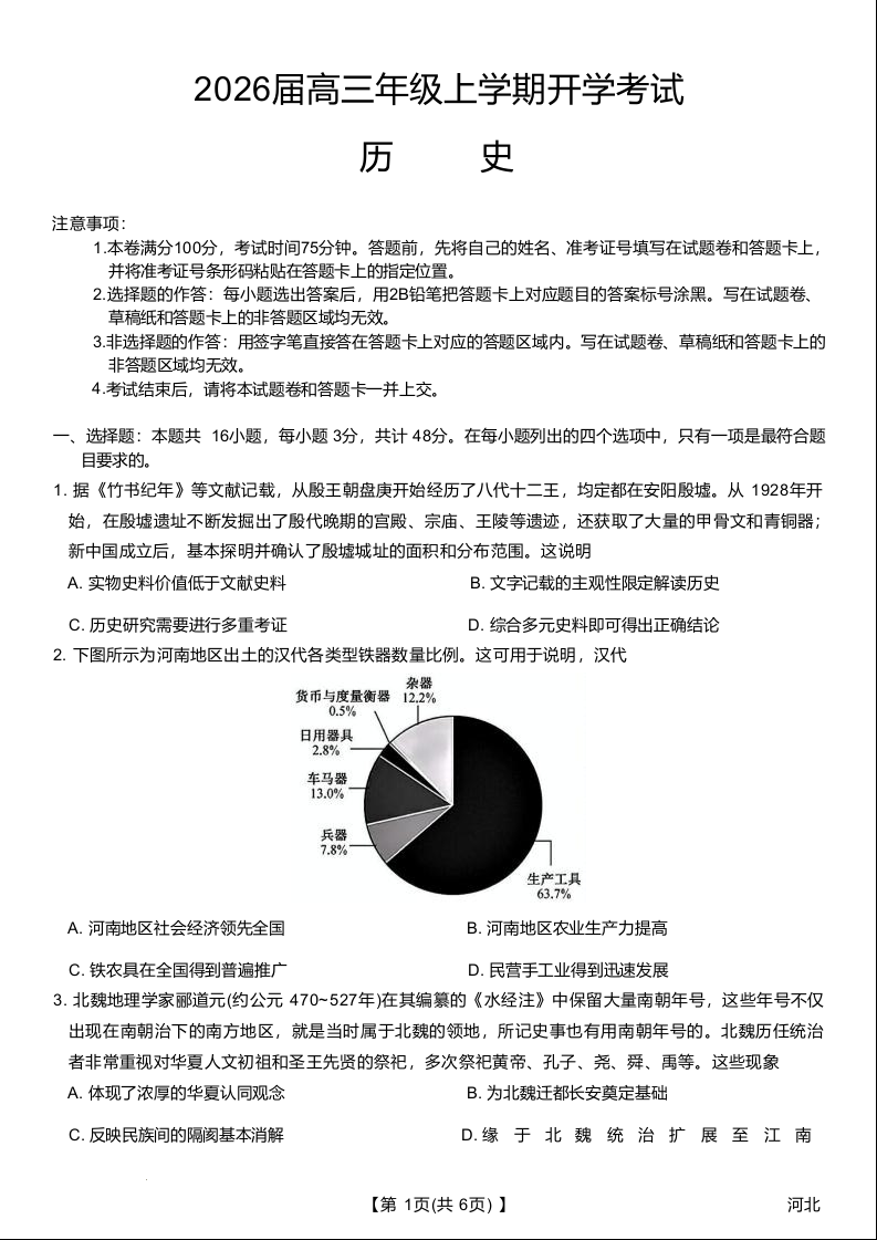 高三历史+答案--河北省保定市定州中学2026届高三上学期8月开学考试
