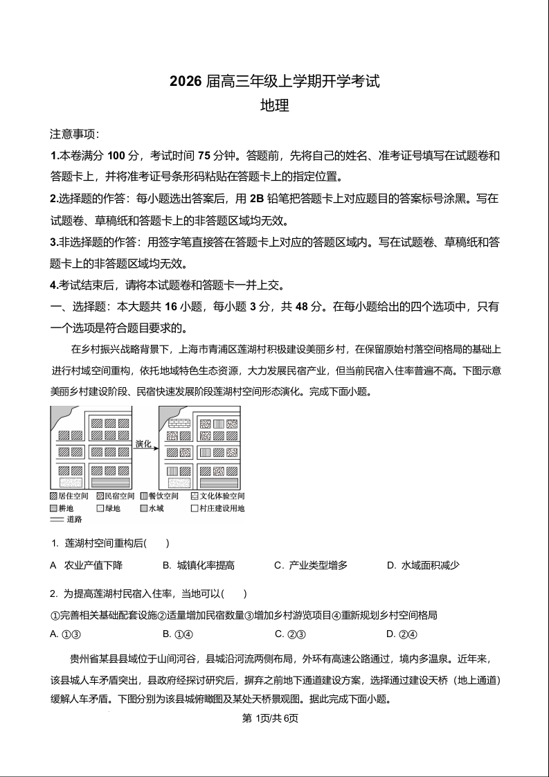 高三地理(原卷版)--河北省保定市定州中学2026届高三上学期8月开学考试