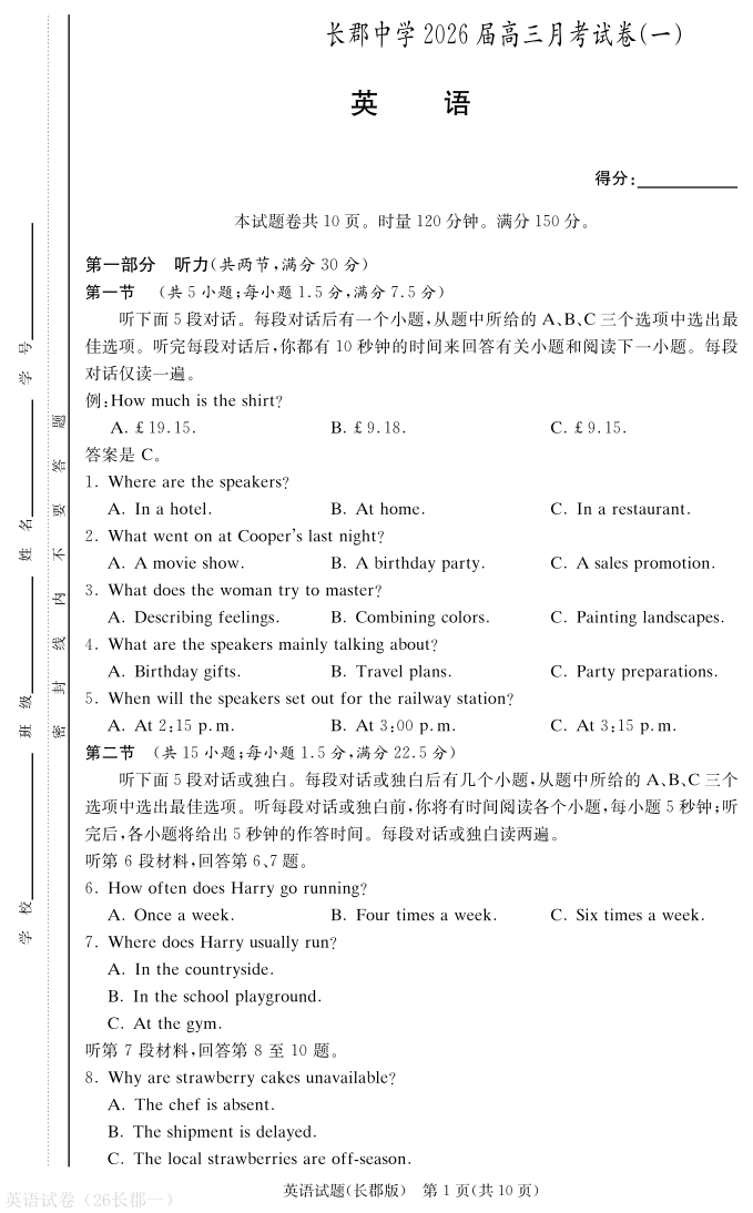 高三英语--湖南省长沙市长郡中学2026届高三上学期月考(一)