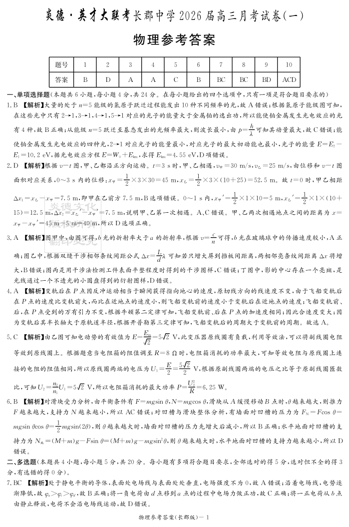 高三物理答案--湖南省长沙市长郡中学2026届高三上学期月考(一)