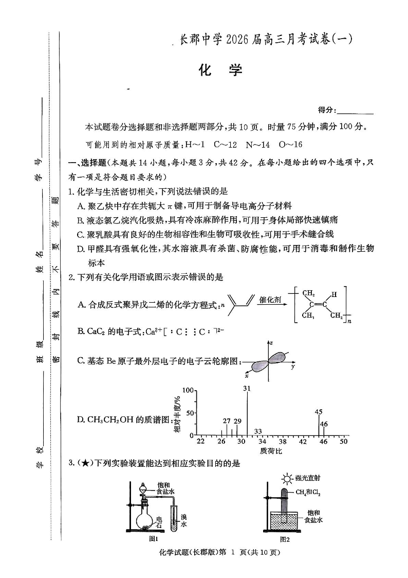 高三化学--湖南省长沙市长郡中学2026届高三上学期月考(一)