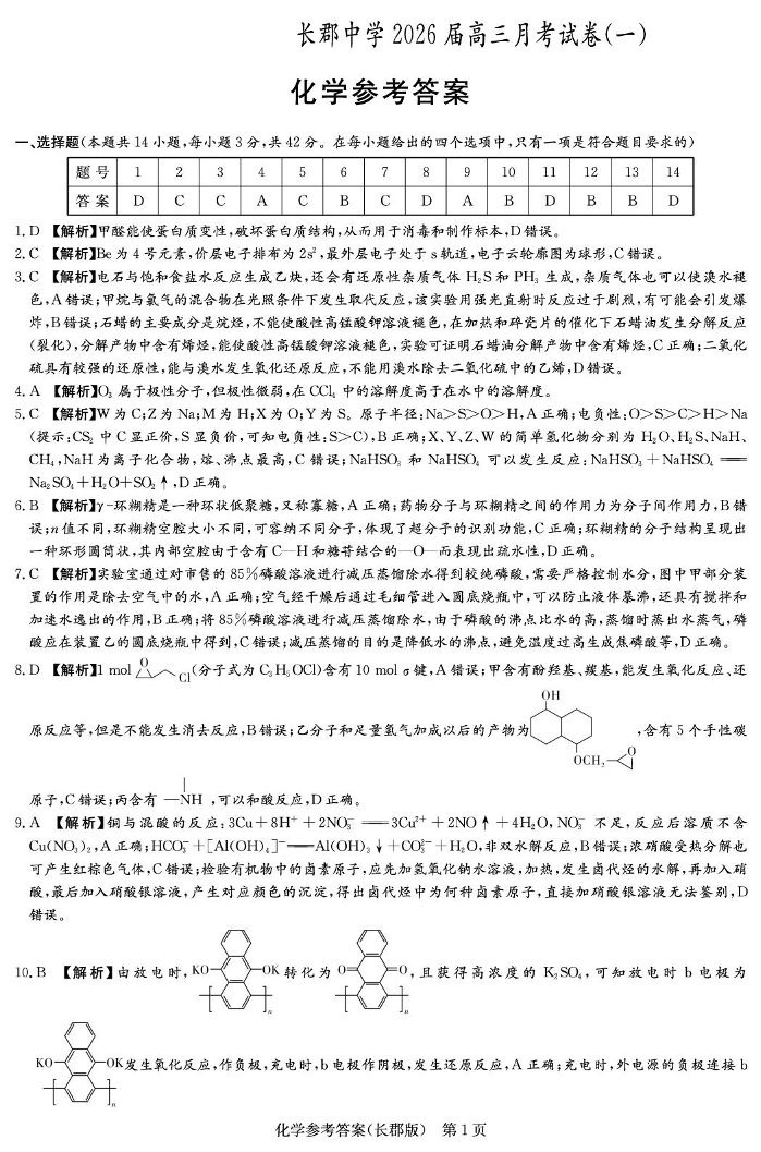 高三化学答案--湖南省长沙市长郡中学2026届高三上学期月考(一)
