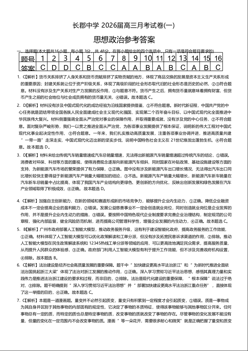 高三政治答案--湖南省长沙市长郡中学2026届高三上学期月考(一)