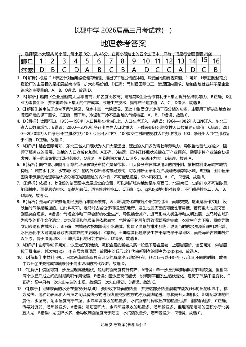 高三地理答案--湖南省长沙市长郡中学2026届高三上学期月考(一)