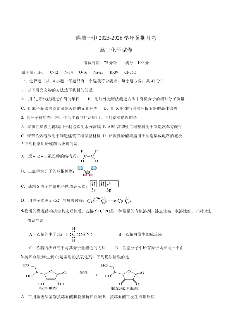 高三化学+答案--福建省连城县第一中学2026届高三上学期8月暑假月考