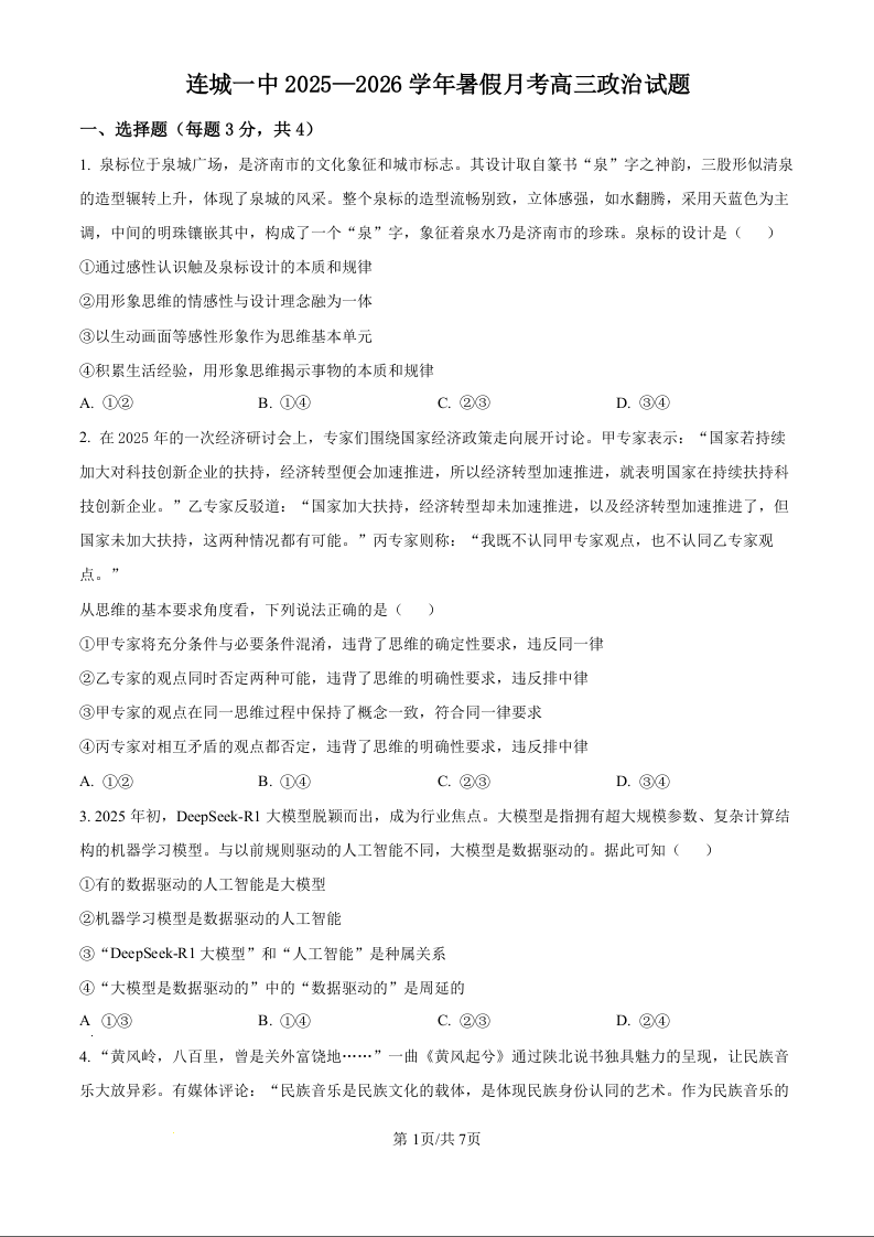 高三政治(原卷版)--福建省连城县第一中学2026届高三上学期8月暑假月考