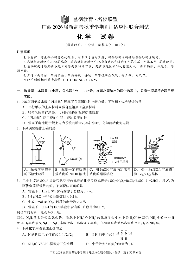 高三化学--广西邕横教育名校联盟2026届高三上学期8月联合调研测试