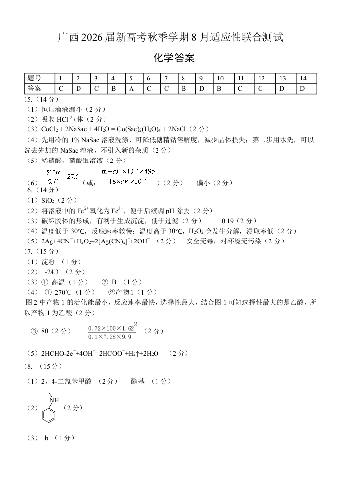 高三化学答案--广西邕横教育名校联盟2026届高三上学期8月联合调研测试