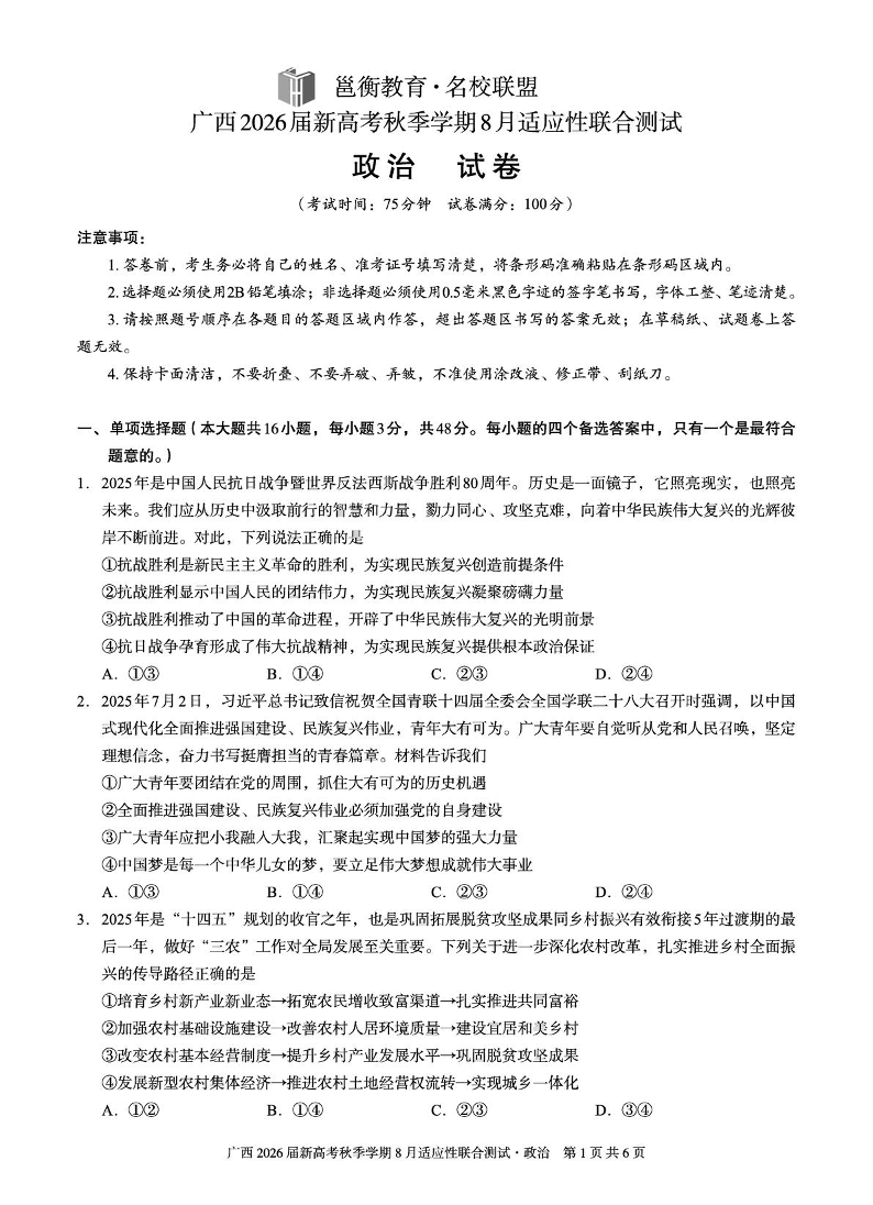 高三政治--广西邕横教育名校联盟2026届高三上学期8月联合调研测试