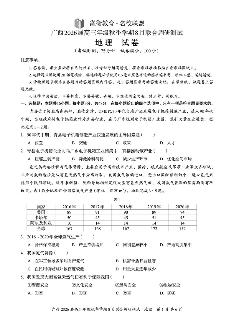 高三地理--广西邕横教育名校联盟2026届高三上学期8月联合调研测试