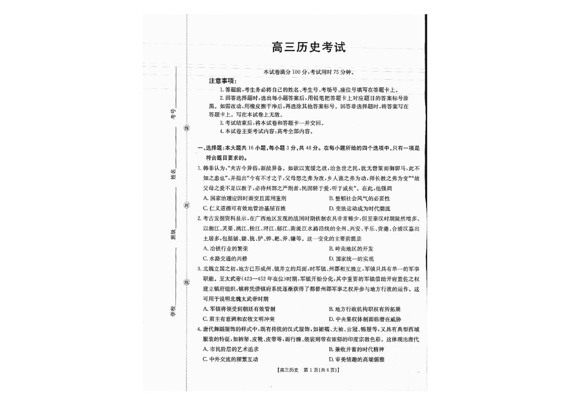 高三历史--广西壮族自治区来宾高级中学2026届高三上学期8月开学检测
