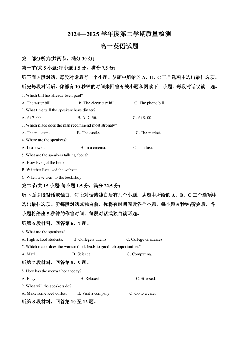 高一英语+答案--山东省济宁市2024-2025学年高一下学期期末考试