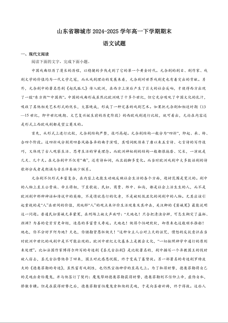 高一语文+答案--山东省聊城市2024-2025学年高一下学期期末考试