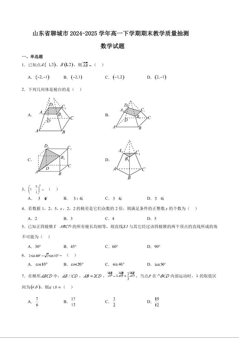 高一数学+答案--山东省聊城市2024-2025学年高一下学期期末考试