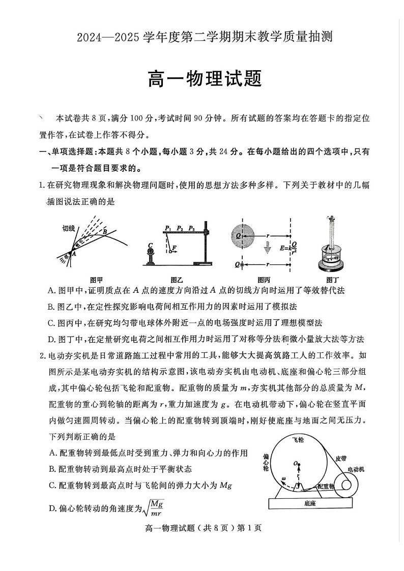 高一物理--山东省聊城市2024-2025学年高一下学期期末考试
