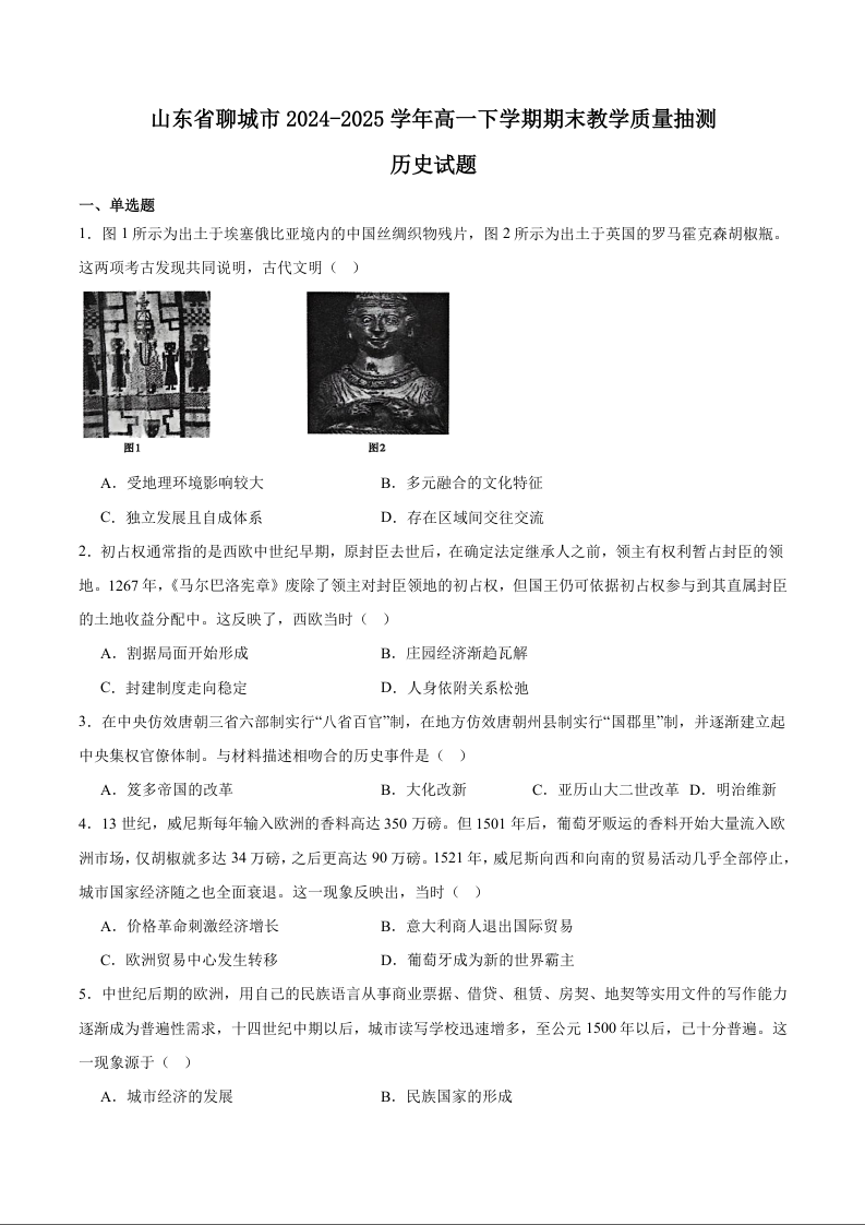 高一历史+答案--山东省聊城市2024-2025学年高一下学期期末考试